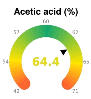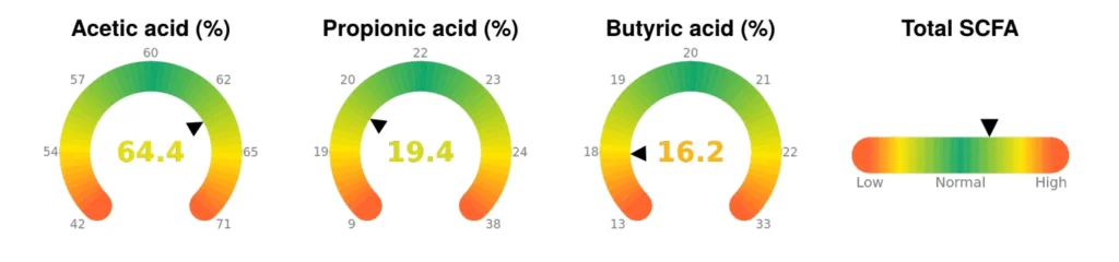 ~60% of SCFAs. Acetic Acid, making up about 60% of your SCFAs, is crucial for nutrient absorption, pH regulation, metabolism and immune function. Low levels of acetic acid (<40%) lead to poor nutrient absorption, increased harmful bacteria, and impaired metabolism. High levels (>80%) lead to inflammation, bloating and diarrhea.