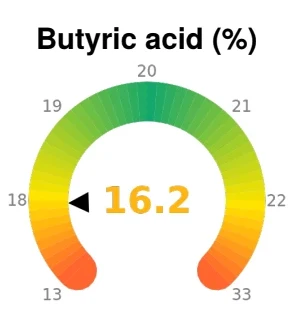 ~20%. Butyric Acid should be about 20% of your SCFAs. Butyric acid is one of the most important molecules in biology. It serves as the primary energy source for colon cells, strengthening the intestinal barrier while reducing inflammation throughout the body. Potential benefits include improved symptoms of IBS, IBD (Crohn’s disease, ulcerative colitis), reduced colon cancer risk, and support for brain health and metabolic function.