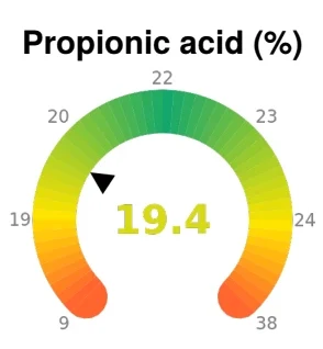 ~20%. Propionic Acid is a major microbial fermentation metabolite in the gut. It should make up about 20% of your SCFA levels. It is linked to reduced lipogenesis, which is the process of fat production in the body. High levels of propionic acid may also help reduce cholesterol levels, and play a role in preventing cancer development in various tissues.